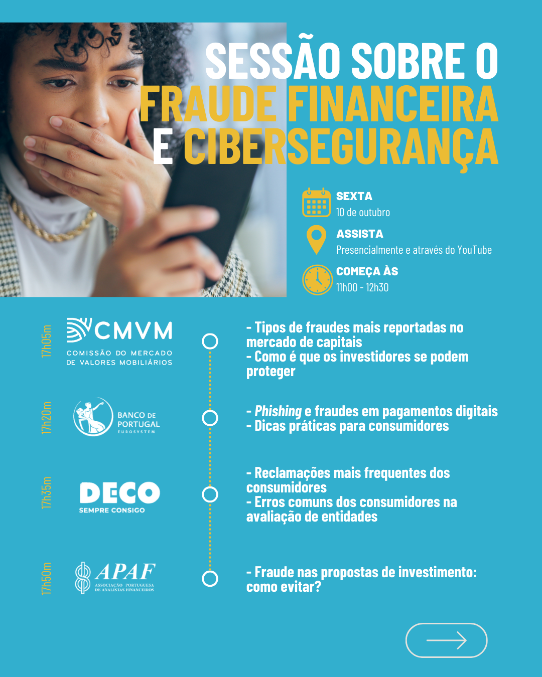 APAF – Portuguese Association of Financial Analysts, once again a partner of the CMVM in this initiative, is pleased to invite you to the session on Financial Fraud and Cybersecurity, which will take place on October 10th at 11:00 am. Dr. Manuel Puerta da Costa will be the speaker, along with partners CMVM, Banco de Portugal, and DECO.